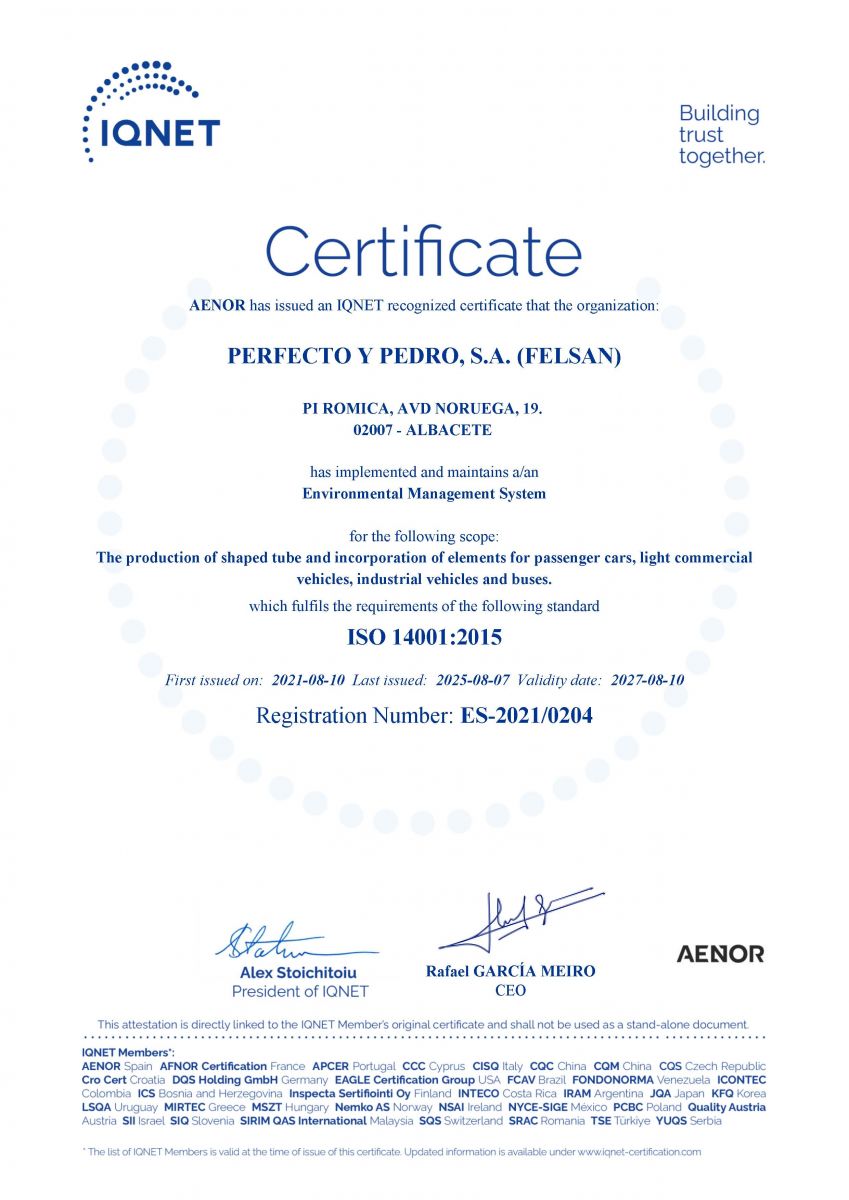 Certificate shown FELSAN quality works unader IATF (International Automotive Task Force) requierements in the production of formed tube and components assembling for passenger cars, light commercial vehicles, heavy trucks, motorcycles and buses, to supply the follwing groups:
